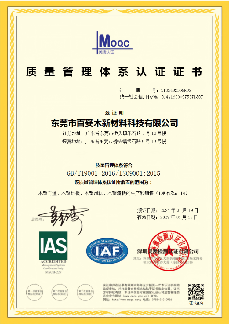 能够获得全球30+国家客户的青睐,百妥木的核心底气,源于权威质量管理体系的全面赋能与严格践行。作为通过GB/T19001-2016/ISO9001:2015质量管理体系认证的企业,百妥木拥有编号为51324Q2338ROS的正规认证证书,统一社会信用代码91441900097597180T,认证范围覆盖木塑方通、木塑地板、木塑滑轨、木塑墙板的生产与销售(IAF代码:14),认证有效期自2024年01月19日至2027年01月18日,这份认证不仅是企业质量管理能力的权威背书,更是百妥木产品符合国际标准的核心证明。