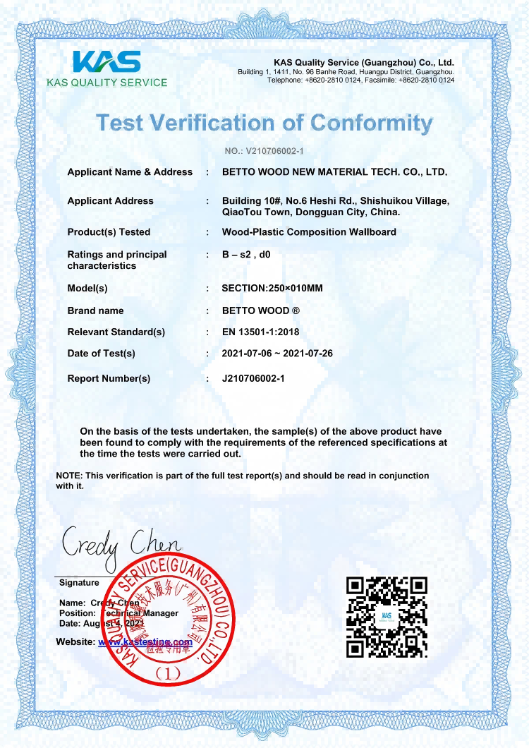 不同于市面上多数品牌的“口头承诺”,百妥木塑木墙板的阻燃性能,有国际权威检测报告作为坚实支撑。经KAS Quality Service(广州)有限公司专业检测,百妥木塑木墙板(产品名称:Wood-Plastic Composition Wallboard,型号:SECTION:250×010MM,品牌:BETTO WOOD ®)顺利通过符合性测试,获得B-s2,d0级阻燃认证,严格符合EN 13501-1:2018欧洲建筑产品防火分类标准,这份认证不仅是对产品阻燃性能的高度认可,更是百妥木产品具备国际竞争力的核心证明,为产品出口全球奠定了坚实基础。