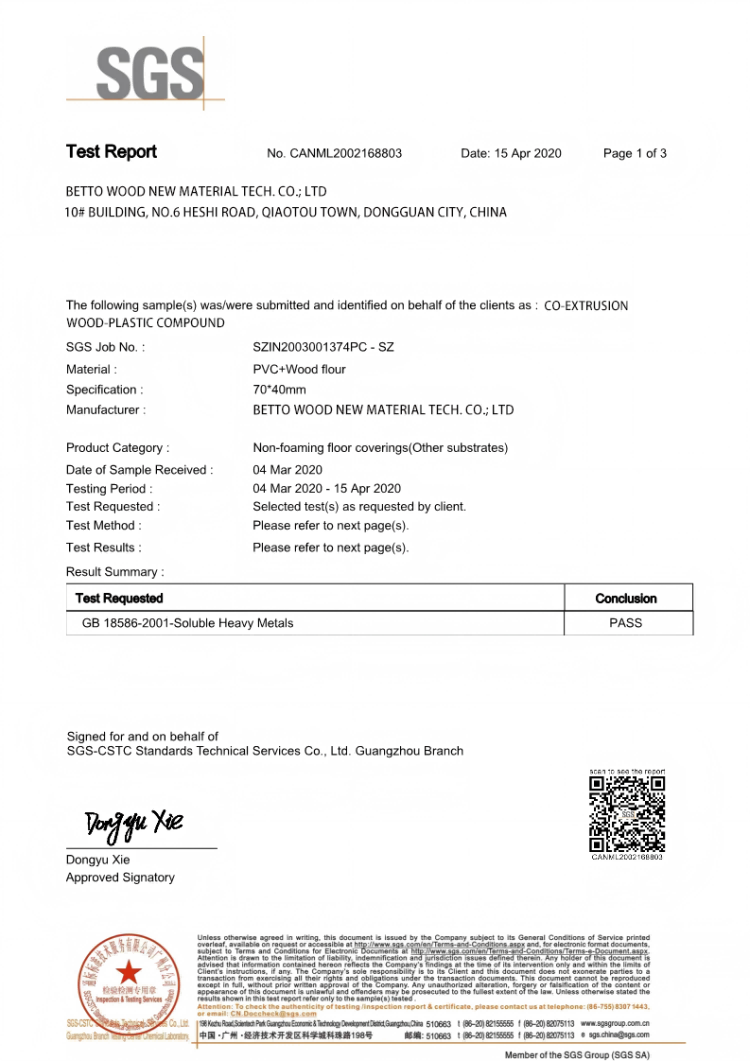 百妥木深耕高端塑木出口领域多年,深谙全球各国的合规要求,始终将“合规出海”作为企业发展的核心战略,主动规避出口风险。为确保产品能够顺利进入全球各个市场,百妥木摒弃了行业内“被动检测”的传统模式,主动对接全球权威检测机构SGS,开展可溶性重金属专项检测,用第三方权威数据为产品出口“保驾护航”。本次检测报告编号为CANML2002168803,检测日期为2020年4月15日,全程按照标准化流程开展,检测结果具有极高的权威性和国际认可度,能够直接作为百妥木产品符合各国合规要求的核心依据。