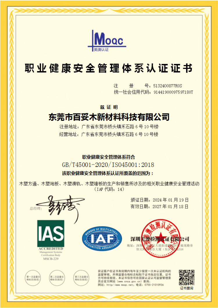 全球市场的认可,始于合规体系的支撑。百妥木深知,出口产品的核心竞争力,离不开权威认证的背书与合规管理的加持。为此,公司率先通过GB/T45001-2020/ISO45001:2018职业健康安全管理体系认证,认证注册号5132400877R0S,统一社会信用代码91441900097597180T,认证范围全面覆盖木塑方通、木塑地板、木塑滑轨、木塑墙板的生产和销售全流程相关职业健康安全管理活动(IAF代码:14),颁证日期为2024年01月19日,有效期至2027年01月18日。该认证是百妥木合规生产、安全管控的有力证明,证书信息可通过国家认证认可监督管理委员会官方网站(www.cnca.gov.cn)查询,也为产品顺利进入全球市场提供了坚实的合规保障。